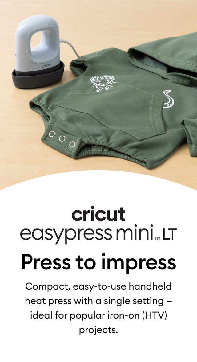 Our compact, easy-to-use handheld heat press with a single setting — ideal for popular iron-on projects like T-shirts, baby clothes, and more. With its precision tip, Cricut EasyPress Mini™ LT helps you access hard-to-reach spaces like around buttons or seams and for uniquely shaped projects. Combining the speed of a heat press and the convenience of an iron, this mini but mighty press delivers results that stand the test of time.