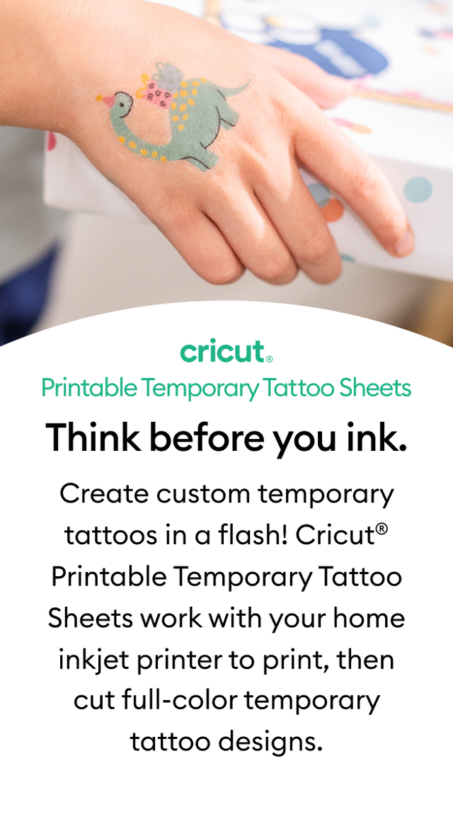 Think before you ink! Create custom temporary tattoos in a flash with Cricut® Printable Temporary Tattoo Sheets. Perfect for party favors, team swag, and more, Temporary Tattoo Sheets work with your home inkjet printer to print, then cut full-color temporary tattoo designs. All Cricut® materials are optimized for Cricut cutting machines with automatic cut settings in Design Space® to ensure you have the best cutting experience.