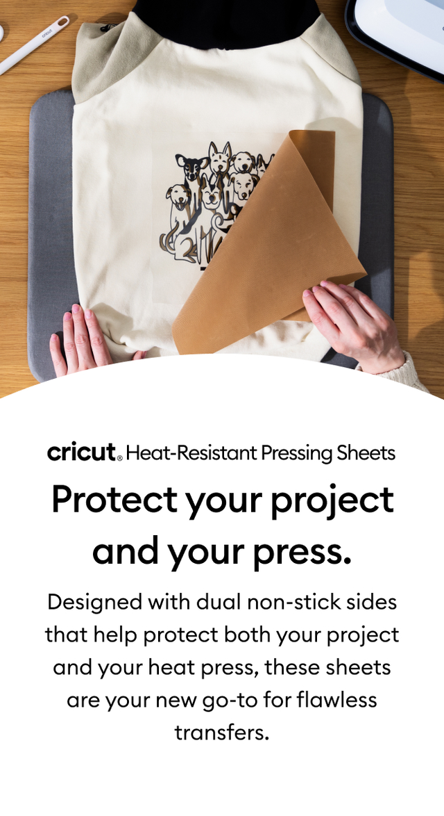 Protect your project and keep your heat press clean with Cricut® Heat-Resistant Pressing Sheets. Designed with dual non-stick sides that help protect your project by covering areas not being pressed. Plus, it prevents staining your heat press plate from material transfers like ink and paint. To use, simply place sheet on top of your project, then apply your Cricut heat press. Once transfer is complete, remove sheet and wipe clean with a dry cloth for reuse.