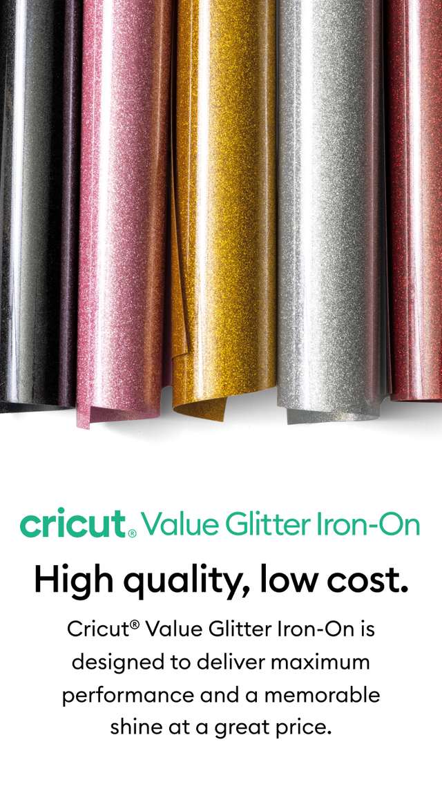 Just add heat! With Cricut® Value Glitter Iron-On, you can personalize T-shirts, jackets, backpacks, and so much more — in shimmery style. Plus, bulk sizes means more making. It also has a clear, heat-resistant backer for easy pressing, and outlasts multiple washes. Cricut Value Iron-On is engineered to give you the perfect blend of cost and quality. By selling in bulk sizes and with simple packaging, we pass the savings on to you. Optimized for Cricut cutting machines. Automatic cut settings in Design Space® ensure you have the best cutting experience with every Cricut material and machine.